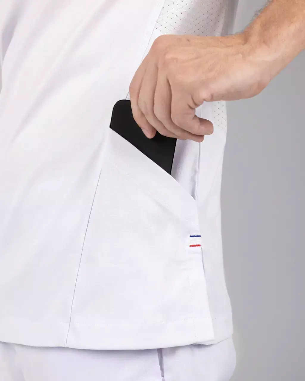 Desenvolvida especialmente na cor branca, a blusa Kai Blanc mantém o mesmo design e modelagem da clássica Kai, mas foi confeccionada com um tecido premium exclusivo não transparente, ideal para uso profissional.
